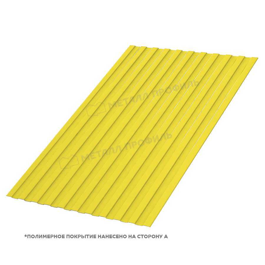 Профлист С-8 с толщиной 0,7 мм и покрытием полиэстер в цвете RAL 1018 (желтый цинк) от Металл Профиль представляет собой надежный материал для ограждений, фасадов и кровли. Сторона A обеспечивает эстетичный вид и долговечность. Этот продукт сочетает прочность металла с защитным слоем, подходящим для различных климатических условий.